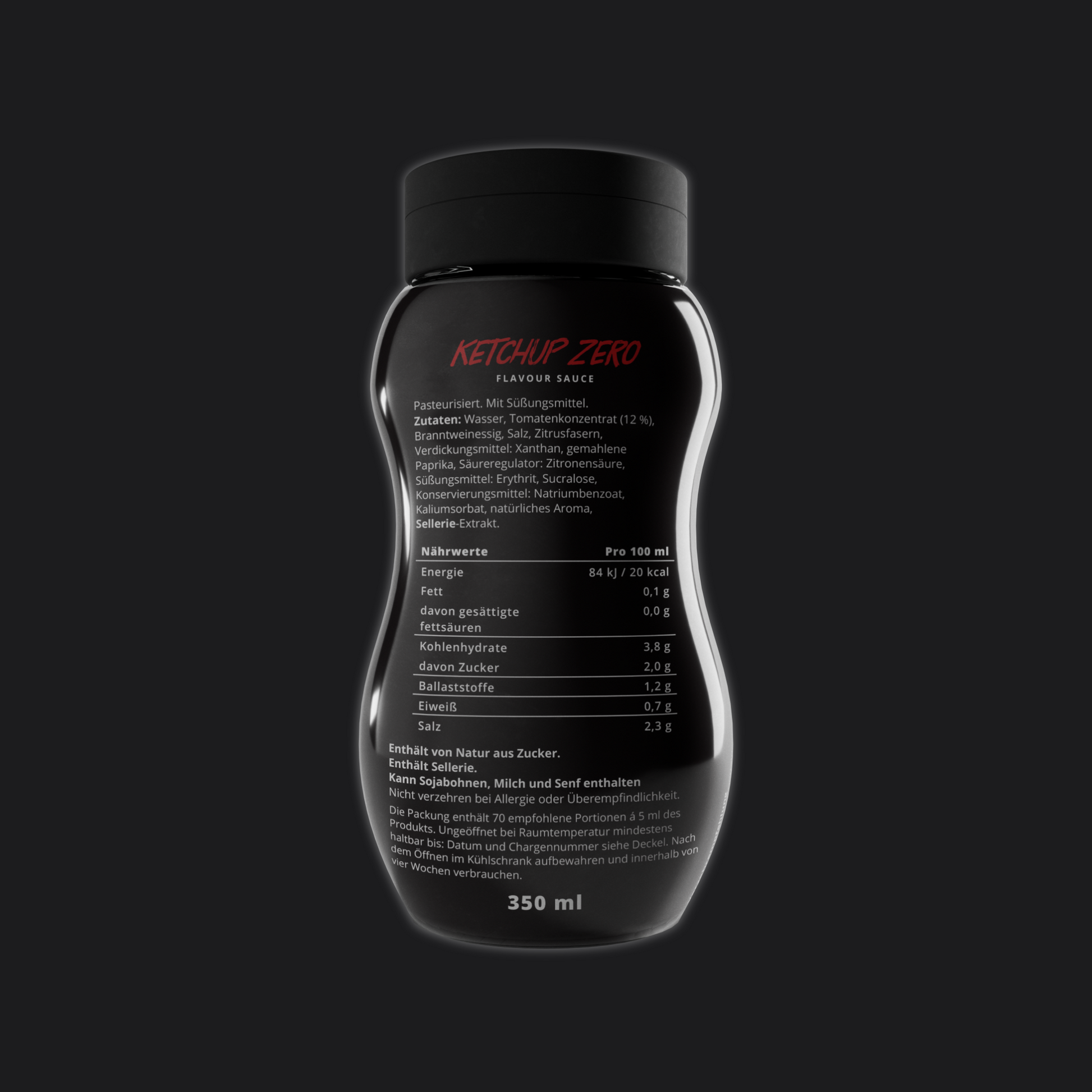 Wasser, Tomatenkonzentrat 12%, Weinbranntessig, Salz, Zitrusfaser, Verdickungsmittel: Xanthan, gemahlene süße Paprika, Säureregulator: Zitronensäure, Süßungsmittel: Erythrit, Sucralose, Konservierungsstoffe: Natriumbenzoat, Kaliumsorbat, natürliches Aroma, Sellerieextrakt